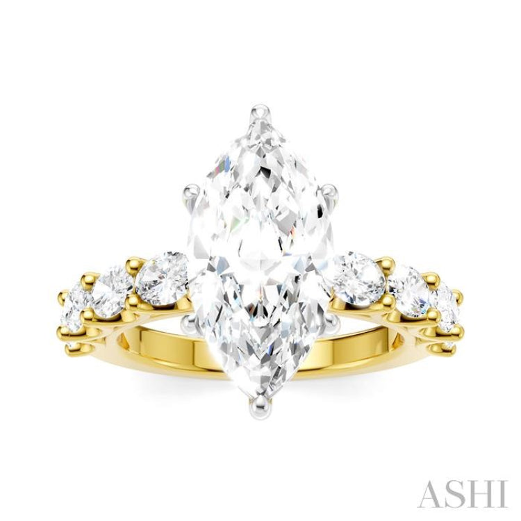 A reflection of your unique love story, this Semi-Mount diamond engagement ring has been meticulously crafted to capture its essence. It features at its core, a prong-raised marquise-shaped center mount that eagerly awaits a perfect marquise cut diamond, ranging between 2.75 Ctw to 3.50 Ctw of your choice. But the beauty doesn't end here. The shank comes pre-adorned with 4 each fancy prong set 1/6 Ctw oval cut diamonds on either side, adding a touch of sophistication and balance to the design. As you gaze upon the ring, you will notice the delicate brilliance of the 14 microscopic split prong set round cut diamonds embellishing the gallery region. The Semi-Mount engagement ring is crafted in a rhodium finish 14 karat yellow and white gold. The total diamond weight is 1 1/3 Ctw.
