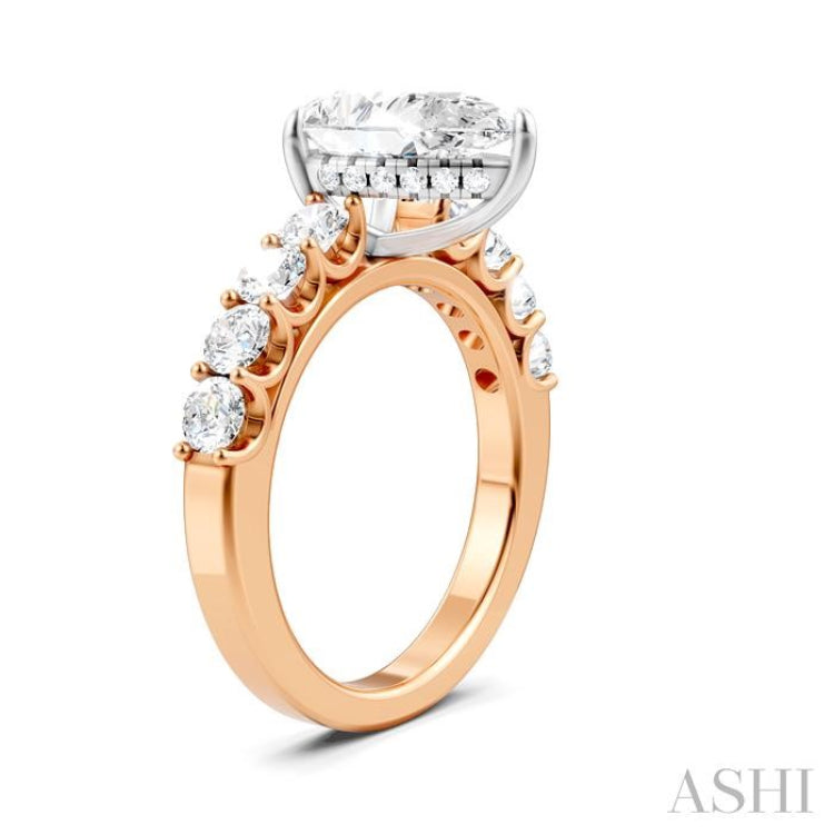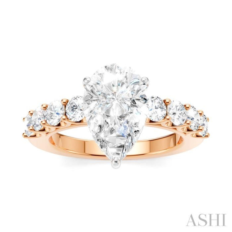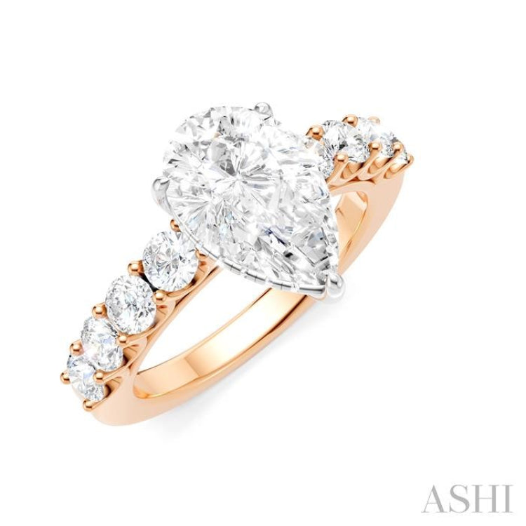 A charming Semi-Mount diamond engagement ring, this makes your proposal even more romantic with your personal touch added to it. The ring features a prong-raised pear-shaped center mount, ready for a center stone of your choice. This should be a pear cut diamond in the range of 1.65 Ctw to 2.35 Ctw. The shank comes pre-embellished with 4 each, 1/6 Ctw round cut diamonds on either side, adding to the elegance of the ring. Also, pre-adorning the gallery region are 16 microscopic split prong set round cut diamonds. A rhodium finished 14 karat rose and white gold offers luminous sophistication to the Semi-Mount diamond engagement ring. The total diamond weight is 7/8 Ctw.