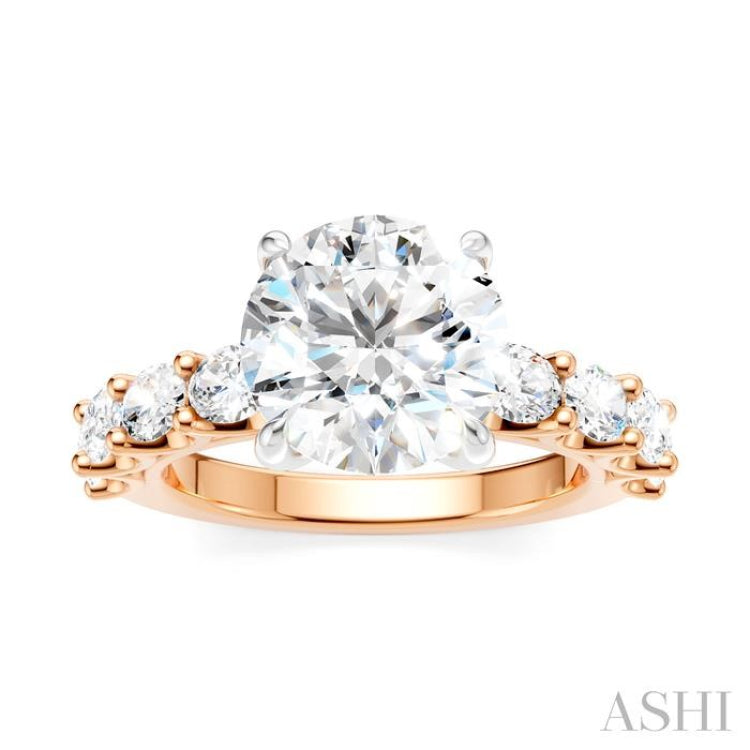 Celebrate your love story with this exquisite and meaningful Semi-Mount diamond engagement ring, destined to be treasured for a lifetime. Skillfully crafted with attention to detail, the ring features at its center, a 14 karat white gold prong-raised round-shaped mount designed to hold a center stone of your choice. This must be an round cut diamond in the range of 2.75 Ctw to 3.50 Ctw. Complementing the center mount are pre-adorned 4 each fancy prong set 1/6 Ctw oval cut diamonds on either side of the shank, adding a touch of glamour and refinement to the ring. Enhancing the gallery region are 10 microscopic split prong set round cut diamonds. The Semi-Mount engagement ring is fashioned in a rhodium finish 14 karat rose and white gold. The total diamond weight is 1 1/4 Ctw.