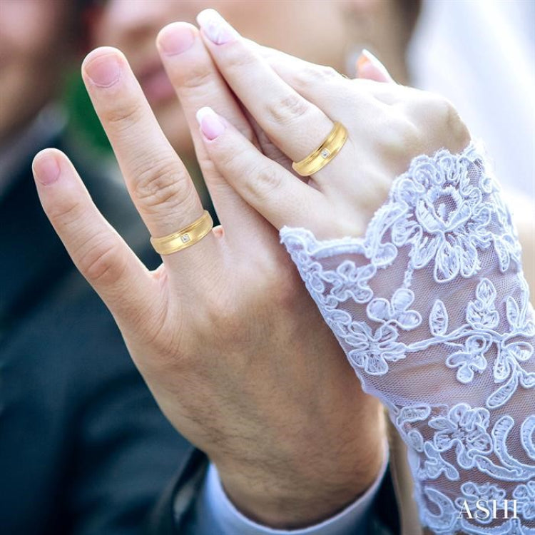 Express your deep intimacy and lasting togetherness with this charismatic diamond duos ring Set blazing in lustrous 14 karat yellow gold. Each ring in this mesmerizing set features a captivating princess cut diamond in bezel setting with glowing satin finish. The total diamond weight for the set is 1/6 Ctw.