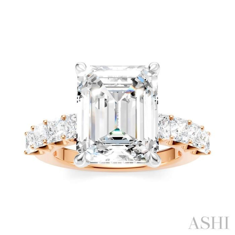 Make your love story unforgettable with this exquisite and meaningful Semi-Mount diamond engagement ring, which is more than just a piece of jewelry-it is a symbol of your love. At its heart lies a prong-raised emerald-shaped center mount, where a center stone of your choice, a emerald cut diamond ranging between 3.65 Ctw to 4.50 Ctw is installed. The beauty does not stop here, as the shank comes pre-embellished with 4 each fancy prong set 1/6 Ctw princess cut diamonds on either side. As you admire the ring from every angle, you will notice 10 sparkling microscopic split prong set round cut diamonds adorning the gallery region. The Semi-Mount engagement ring is molded in a rhodium finish 14 karat rose and white gold. The total diamond weight is 1 1/3 Ctw.
