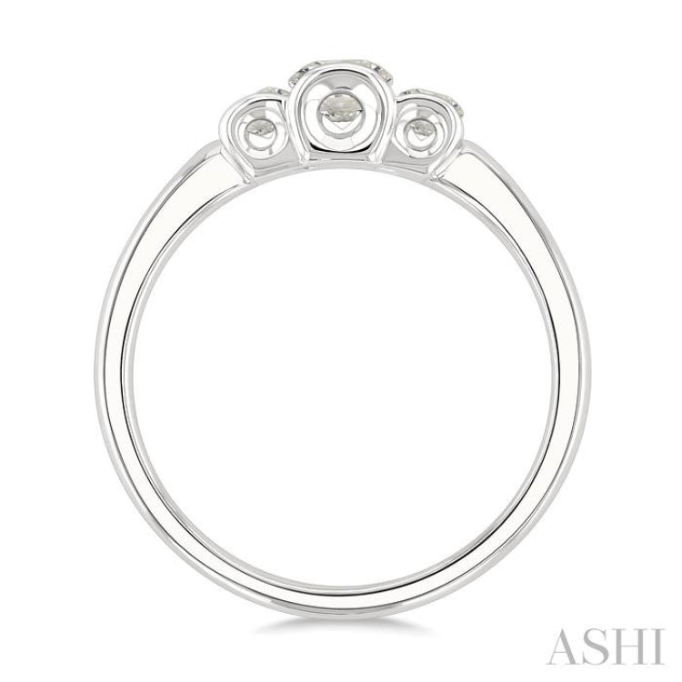 Timeless brilliance defines this diamond fashion ring, designed with three arched mounts that flow seamlessly into one another to form a striking centerpiece. At its heart rests a dazzling 1/3 Ctw round cut diamond, commanding attention with its radiant sparkle. On either side, a 1/5 Ctw round cut diamond provides balance and symmetry, enhancing the beauty of the central stone while adding luminous depth. Styled in rhodium finish 14 karat white gold, the diamond fashion ring combines classic three-stone elegance with refined craftsmanship, making it a versatile piece that captures light and admiration from every angle. Total diamond weight is 1/2 Ctw.