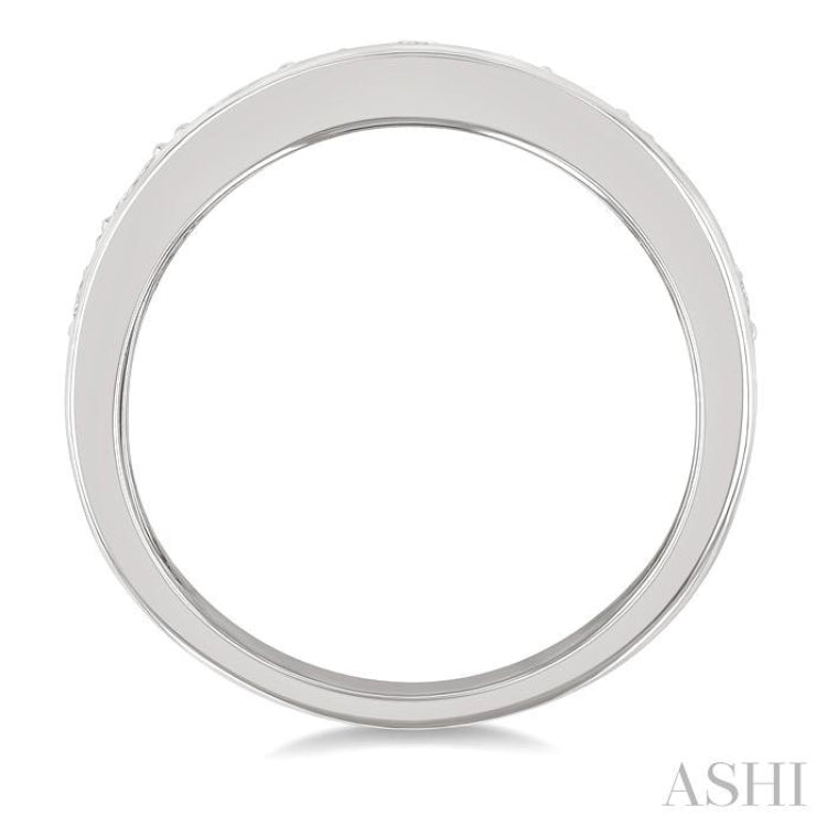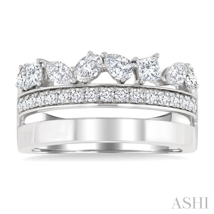 This diamond fashion wide band showcases a bold yet refined design, blending classic and modern elements with dazzling diamonds. It features a split top, creating a twin-ring effect. One side boasts a polished plain gold finish, while the other sparkles with 17 prong set round cut diamonds, forming a radiant base. Crowning this base is an intricate arrangement of mixed cut diamonds, each uniquely shaped for added allure. At the center, a 1/8 Ctw oval cut diamond and a 1/8 Ctw pear cut diamond shine prominently. Flanking these are an elegant sequence of diamonds. Following the oval diamond are a 1/10 Ctw marquise, 1/8 Ctw princess, and a 1/10 Ctw round cut diamond. On the other side, tailing the pear diamond are a 1/8 Ctw princess, 1/10 Ctw marquise, and a 1/10 Ctw round cut diamond in this order. Designed in a polished rhodium finish 14 karat white gold, this striking band is a perfect expression of individuality and style. Total diamond weight is 1 1/6 Ctw.