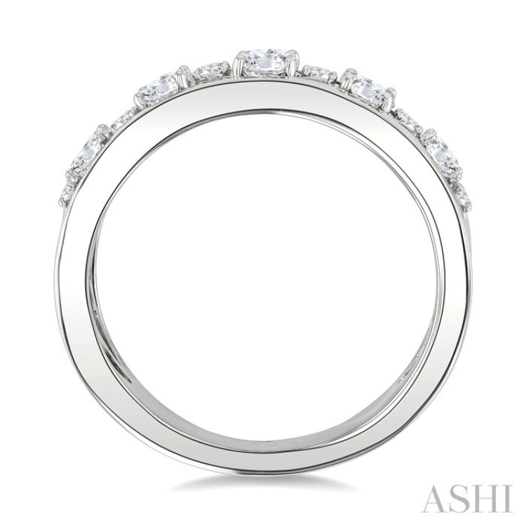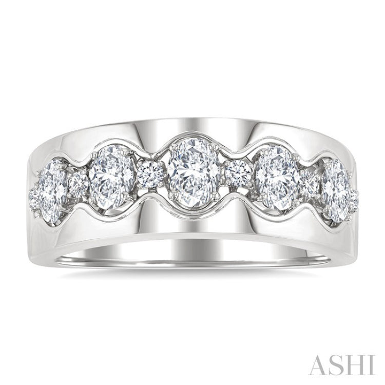 An eye-catching wide diamond fashion band, this exudes elegance with its unique design. It showcases a curvy open window panel along the center, perfectly cradling 5 prong set oval cut diamonds within its graceful grooves. Between each oval cut diamond, a sparkling prong set round cut diamond, total 6, adds extra brilliance. The wide fashion band is designed in a luxurious polished rhodium finish 14 karat white gold, which enhances the radiance of the diamonds, making this a captivating piece that blends classic beauty with modern sophistication. Total diamond weight is 1 Ctw.