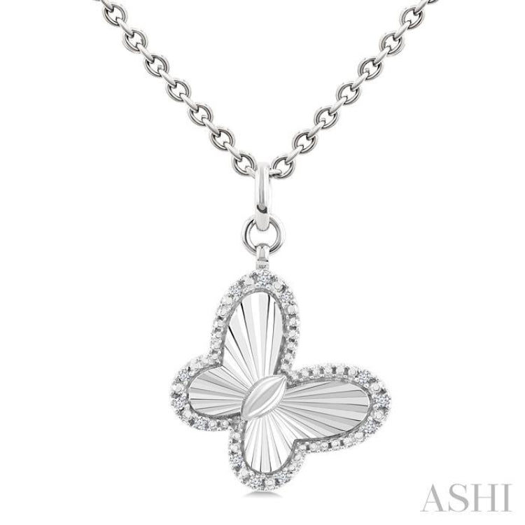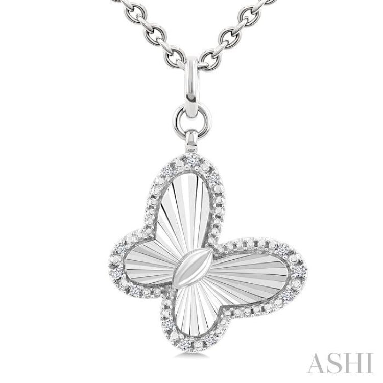 The butterfly stands for transformation, rebirth, and the freedom to embrace new beginnings. A flutter of light and texture meets meaningful symbolism in this diamond pendant. Whether worn as a personal talisman or given to honor someone embarking on a fresh chapter, its union of delicate carving, subtle texture, and pinpoint diamond accents makes for a piece that is both striking and heartfelt. The pendant features gently fluted concentric ridges guiding the eye toward the butterfly-shaped cutout. 12 prong hand set single cut diamonds trace the butterfly's outline, their collective sparkle lending definition and brilliance to the open wings. Suspended from a circular link that attaches to a plain silver bail, the pendant drapes from an Oval Link Chain 4.50 MM in 18 Inches with Lobster Lock, both styled in rhodium finish silver. Total diamond weight is 1/10 ctw.