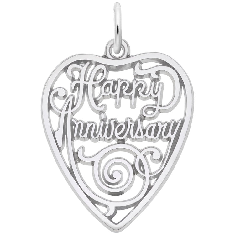 Capture the love and celebrate your special day with this Happy Anniversary Heart Charm. This elegant item is available in silver and gold.