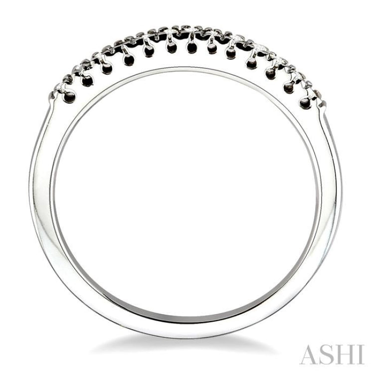 Allure your loved ones with this articulate diamond band fashioned in luminous 10 karat white gold. This beautiful design showcases 13 sparkling round cut diamonds calmly rests in pave set and elegantly accumulates on the band. The total diamond weight is 1/10 Ctw.