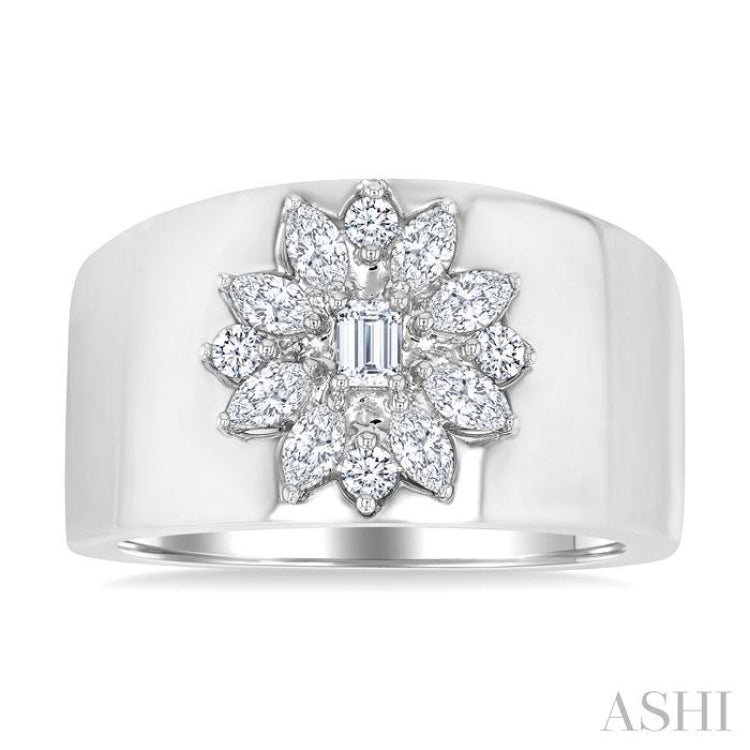 Experience the elegance of nature-inspired design with this gorgeous diamond wide band. The stunning band features a captivating floral centerpiece, crafted with a beautiful array of mixed diamond shapes. At the heart of the centerpiece lies a prong set 1/10 Ctw emerald cut diamond, framed by 8 prong set marquise cut diamonds that form delicate petals. Completing the floral motif, 4 prong set round cut diamonds, one each sitting between each pair of marquise diamonds, add a touch of sparkle. The diamond wide band is styled in a luxurious polished rhodium finish 14 karat white gold, offering a warm, timeless glow. Total diamond weight is 5/8 Ctw.