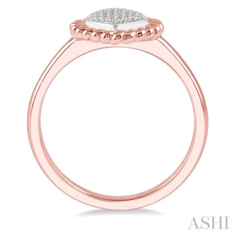 An attractive heart shape diamond ring, this offers simplicity in style. The ring features a heart shape white gold center mount, bordered by a thick trim and embellished with vertical rows of diamonds that fill the center in a charming manner. There is a total of 25 prong set round cut diamonds encrusted on the mount. A twisted trim highlights the heart shape and lends this lattice ring an eye-catching look. The ring is styled in 10 karat rose gold. The total diamond weight is 1/20 Ctw.