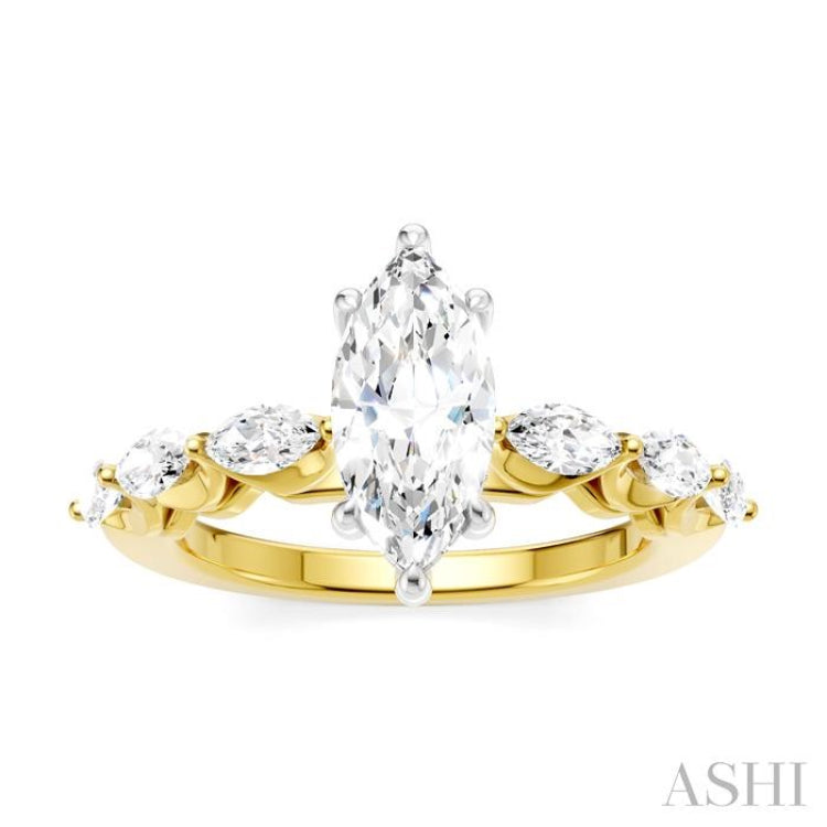 Begin a new chapter of your love with this exquisite Semi-Mount diamond engagement ring that offers a captivating blend of beauty and sophistication. It also gives you the freedom to choose a desired center stone, letting you the opportunity to create a ring that is as unique as your love, and ensuring that every glance at the hand serves as a reminder of the special bond you share. The ring features a 14 karat white gold prong-raised marquise-shaped center mount, where a marquise cut diamond ranging between 0.85 Ctw to 1.20 Ctw of your choice gets installed. Beautifying the shank are pre-decorated, 3 each fancy prong set marquise cut diamonds on either side, total 6 diamonds. 12 microscopic split prong set round cut diamonds embellish the gallery region. The Semi-Mount engagement ring is crafted in a rhodium finish 14 karat yellow and white gold. The total diamond weight is 3/4 Ctw.
