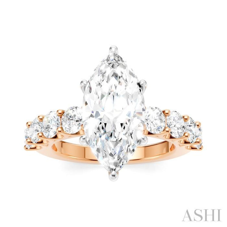 A charming Semi-Mount diamond engagement ring, this makes your proposal even more romantic with your personal touch added to it. The ring features a prong-raised marquise-shaped center mount, ready for a center stone of your choice. This should be a marquise cut diamond in the range of 2.75 Ctw to 3.50 Ctw. The shank comes pre-embellished with 4 each, 1/10 Ctw round cut diamonds on either side, adding to the elegance of the ring. Also, pre-adorning the gallery region are 16 microscopic split prong set round cut diamonds. A rhodium finished 14 karat rose and white gold offers luminous sophistication to the Semi-Mount diamond engagement ring. The total diamond weight is 1 1/3 Ctw.