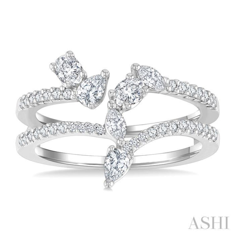 This diamond fashion open ring is a bold and innovative statement piece, blending contemporary design with timeless elegance. Its double-ring design features a striking combination of elements, with one ring boasting a Chevron center while the other displays an open center. Uniquely adorning one open end is an inclined prong set pear cut diamond, paired with an oval cut diamond facing outward. The other open end and the Chevron on the second ring form a bridge of artfully arranged diamonds. The Chevron tip showcases a pear cut diamond, seamlessly followed by a marquise cut diamond, and oval cut diamond forming the crossover path, while finishing with a marquise cut diamond at the open end. Adding brilliance, 37 prong set round cut diamonds embellish the shank of both rings, enhancing their radiant charm. Styled in a polished rhodium finish 14 karat white gold, the fashion open ring exudes modern sophistication. Total diamond weight is 3/4 Ctw.