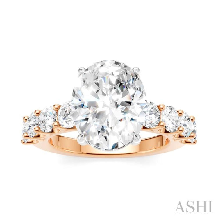 A charming Semi-Mount diamond engagement ring, this makes your proposal even more romantic with your personal touch added to it. The ring features a prong-raised oval-shaped center mount, ready for a center stone of your choice. This should be a oval cut diamond in the range of 3.65 Ctw to 4.50 Ctw. The shank comes pre-embellished with 4 each, 1/10 Ctw round cut diamonds on either side, adding to the elegance of the ring. Also, pre-adorning the gallery region are 16 microscopic split prong set round cut diamonds. A rhodium finished 14 karat rose and white gold offers luminous sophistication to the Semi-Mount diamond engagement ring. The total diamond weight is 1 1/3 Ctw.
