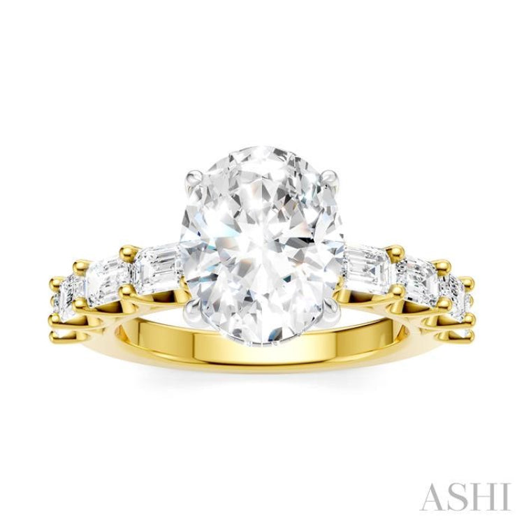 Visually and aesthetically appealing, this gorgeous Semi-Mount engagement ring captures the glamour and essence of the diamonds that decorate it. The exquisite ring features a 14 karat white gold prong-raised oval-shaped center mount, designed to hold a center stone of your liking. This should be a oval cut diamond ranging 2.75 Ctw to 3.50 Ctw. Adding sophistication to the ring are 4 each fancy prong set 1/6 Ctw emerald cut diamonds, pre-adorned on either side of the shank. Accentuating the gallery's brilliance are 14 microscopic split prong set round cut diamonds. Styled in a rhodium finish 14 karat yellow and white gold, the Semi-Mount engagement ring exudes timeless elegance. The total diamond weight is 1 1/3 Ctw.
