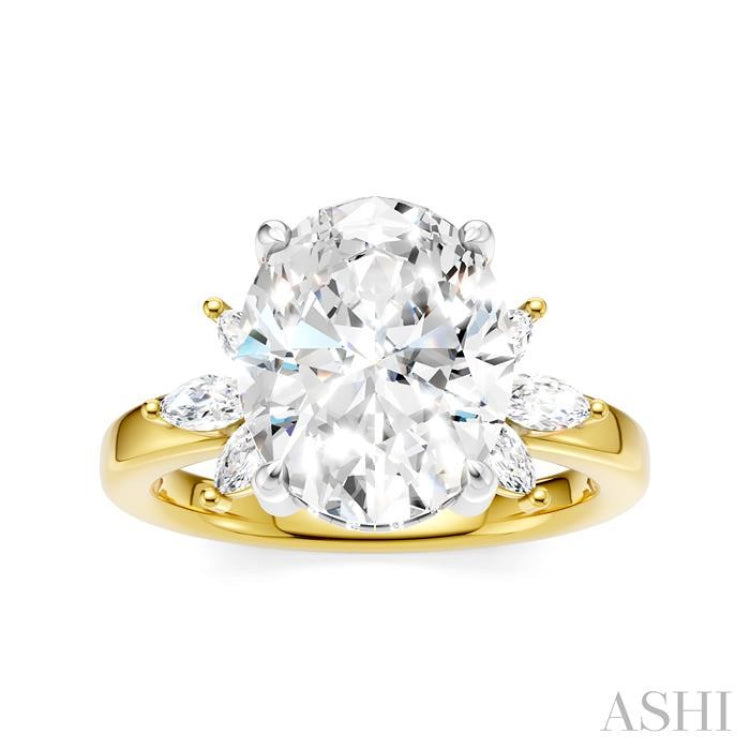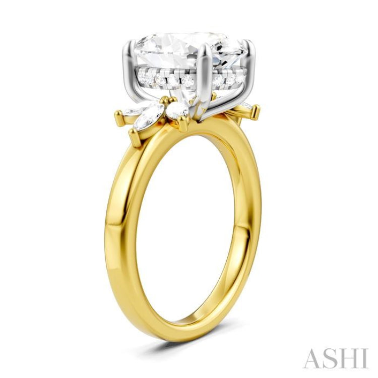 A luminous expression of refinement, this Akari, Japanese word for 'light', semi-mount diamond engagement ring is designed to frame your chosen center stone. Rising at the heart of the design are four white gold prongs, gracefully arched to embrace a 3.65 Ctw to 4.50 Ctw oval cut diamond of your choice. In the gallery, sleek rails contour the shape of the prong frame, each one adorned with 4 microscopic split prong set round cut diamonds, total 16, shimmering like points of starlight. Along the yellow-gold shank, 3 marquise cut diamonds on each side gently unfurl outward in a petal-like bloom, their tapered silhouettes echoing the soft curves of the oval centerpiece. Carved in rhodium finish 14 karat yellow and white gold, the semi-mount ring effortlessly enhances every detail. Total diamond weight is 1/2 Ctw.