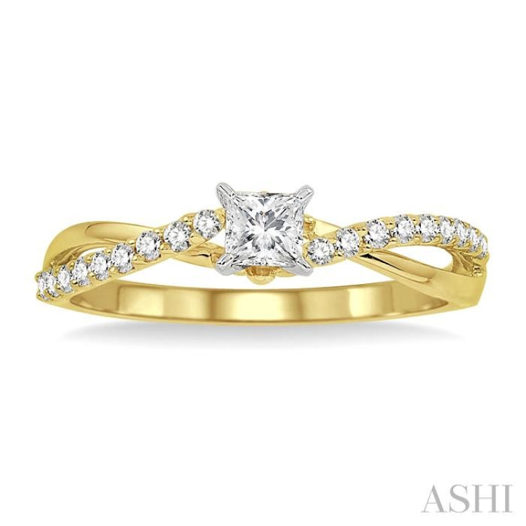 Make a lasting impression on her heart with this remarkable diamond engagement ring beautifully exhibiting a 1/4 Ct princess cut center stone diamond accented by 18 brilliant well-matched round cut diamonds that flow down the shank in criss cross motif. Diamonds are beautifully prong set in 14 karat luminous yellow and white gold. Total diamond weight is 1/2 Ctw.