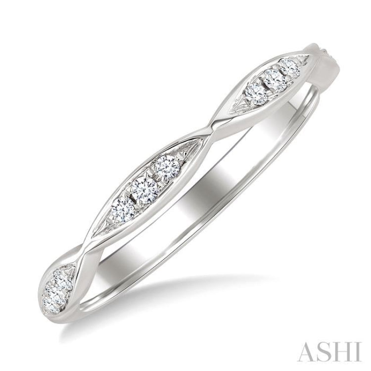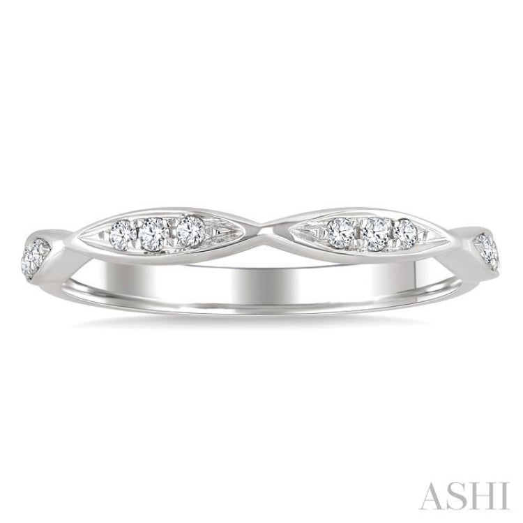 A stackable diamond wedding band, this brings delicate detail and versatile charm to any collection. It features four marquise-shaped mounts carved in a continuous row across the ring top, each adorned with 3 pave hand set round cut diamonds for a total of 12 sparkling accents. Carved in 14 karat white gold with a polished rhodium finish, the diamond wedding band glimmers with refined brilliance while offering durability for everyday wear. Its slim profile makes it ideal for stacking with other bands, yet it also stands beautifully on its own as a subtle statement of style and sophistication. Total diamond weight is 1/10 Ctw.